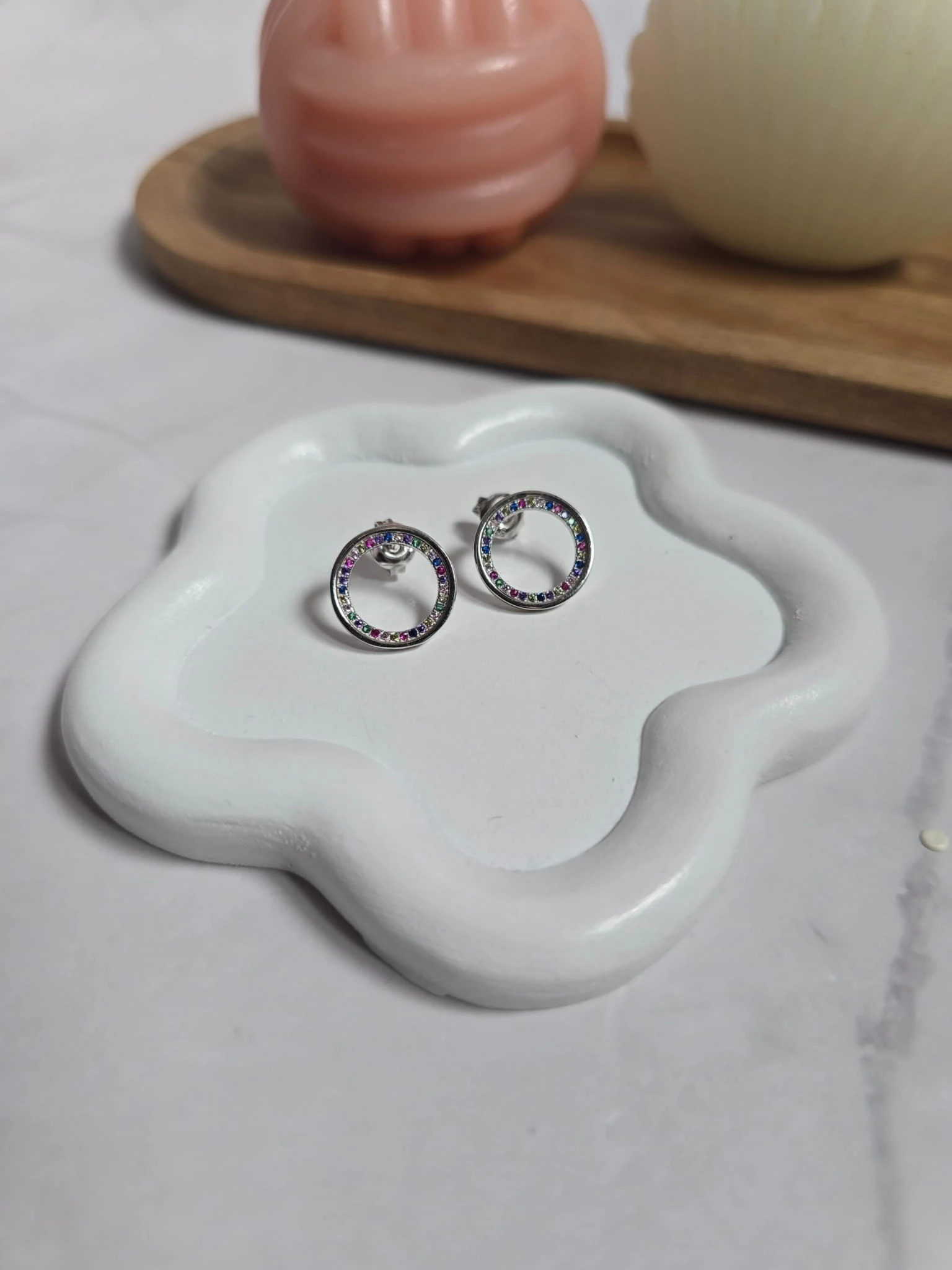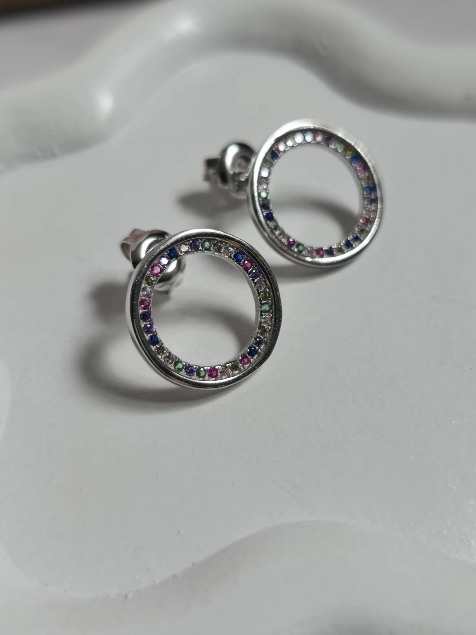 Stylowe kolczyki w formie klasycznych kółek, wykonane z wysokiej jakości srebra próby 925. Ozdobione wielobarwnymi cyrkoniami, które nadają im wyjątkowego blasku i nowoczesnego charakteru.