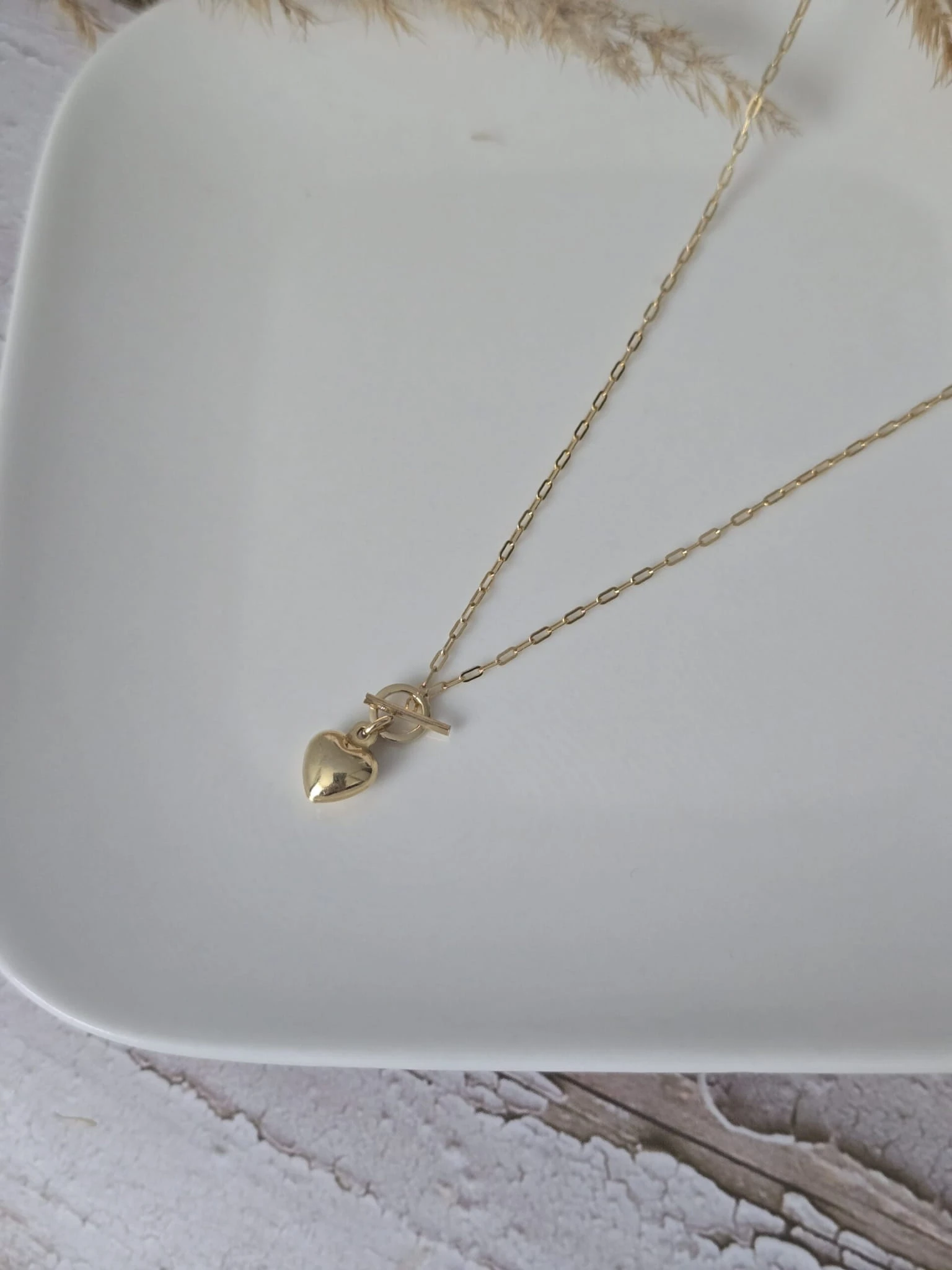 Ten naszyjnik został wykonany ze złoconego srebra 925, a jego centralnym punktem jest delikatna zawieszka w kształcie serca. Zapięcie typu toggle dodaje nowoczesnego charakteru i ułatwia samodzielne zakładanie naszyjnika.